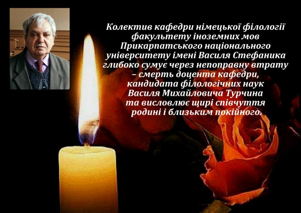 Колектив кафедри німецької філології факультету іноземних мов Прикарпатського національного університету імені Василя Стефаника глибоко сумує через непоправну втрату – смерть доцента кафедри, кандидата філологічних наук Василя Михайловича Турчина та висловлює щирі співчуття родині і близьким покійного.