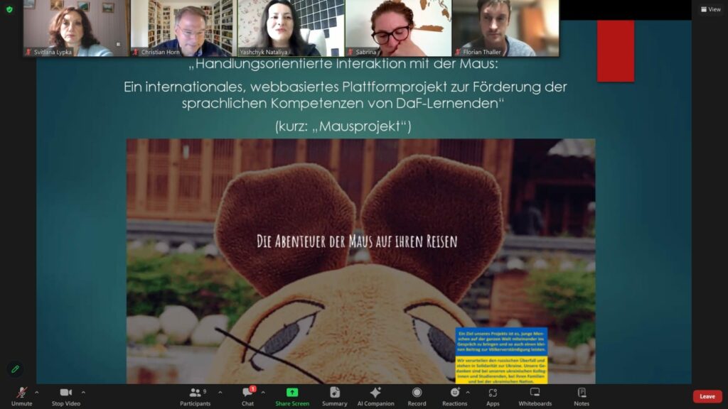Доцентка кафедри німецької філології Світлана Липка Svitlana Lypka взяла участь у онлайн-колоквіумі міжнародного проєкту на основі веб-платформи „Handlungsorientierte Interaktion mit der Maus: Ein internationales, webbasiertes Plattformprojekt zur Förderung der sprachlichen Kompetenzen von DaF-Lernenden“ (коротко: „Mausprojekt“ (проєкт „Миша“), що відбувся 13.10.2023 Читати далі
